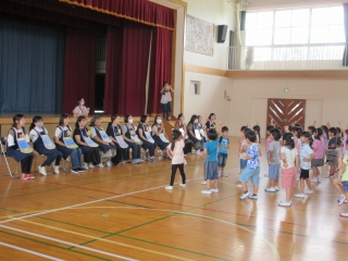 1年生が、4月から6月までお世話になったエプロン先生をご招待し、感謝の会を開きました。感謝の会では、1年生から「ありがとう」の気持ちを込めて、感謝のメダルの贈呈やダンスの披露、歌や言葉のプレゼントなどがありました。4月には不安がいっぱいで大人の助けが必要だった1年生ですが、今ではチャイムが鳴ったら着席し、ひらがなやカタカナが書けるようになり、給食当番や掃除当番の仕事も自分たちでできるようになり、自信がついてきました。これも、エプロン先生が子供たちのそばで優しく教えたり、励ましてくださったおかげです。本当にありがとうございました。