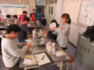 5年生が、家庭科の学習で、みやぎ生協の方を講師にお招きし、災害時の暮らしに備えるための「ローリングストック(循環備蓄)」について学びました。「ローリングストック」とは、災害時にも使える食品(缶詰やレトルト食品、乾燥野菜、ペットボトル飲料など)や日用品(アルミホイル、電池、カイロなど)を、暮らしの中で定期的に消費し、補充を繰り返す方法のことです。食べ慣れていて、少し期限が長めの物を食べたら補充していくという簡単な備蓄方法なのだそうです。家族に必要なものを、栄養バランスを考えて備えて、普段の料理にも使いながら、買い足していくことがポイントになります。子供たちは、講師の先生のお話を聞き、自分の家に必要なものや数を考えたり、実際に乾燥ごぼうを使って非常食を作ったりする活動に取り組みました。